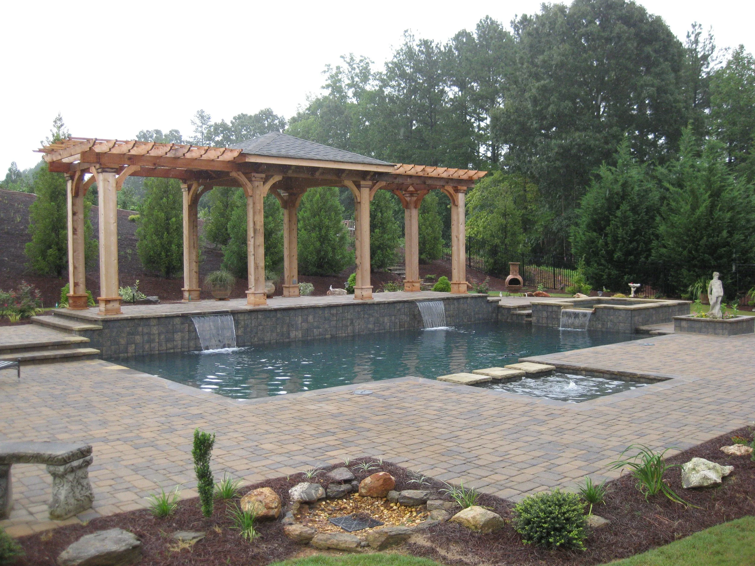 Elevate your backyard experience with our artistic approach leveraging the latest design principles, harmonious color theory, and blends of texture Largest Spa In Atlanta Downtown Glass Tiles Breathtaking European Backyard Rustic Stones & Fire Meditteranean Backyard Organic Rustic Oasis with Glass Tiles